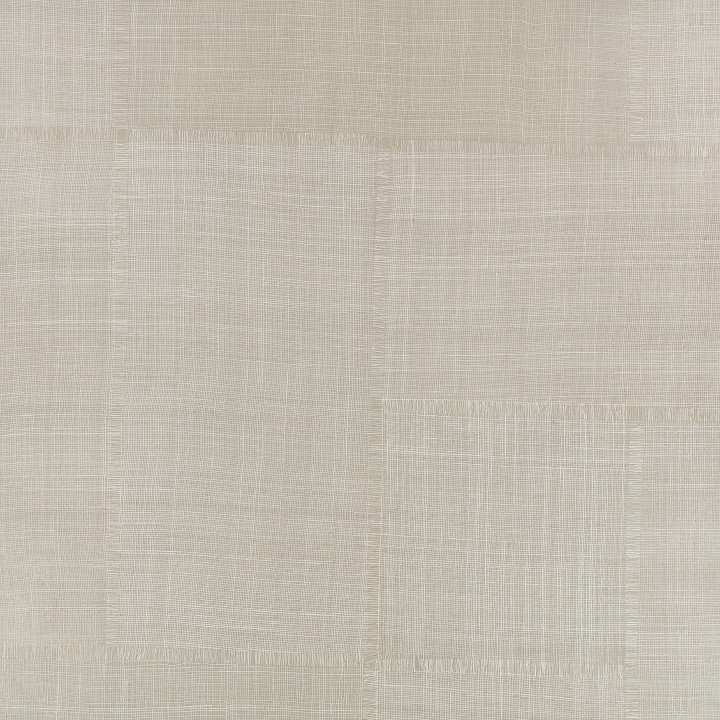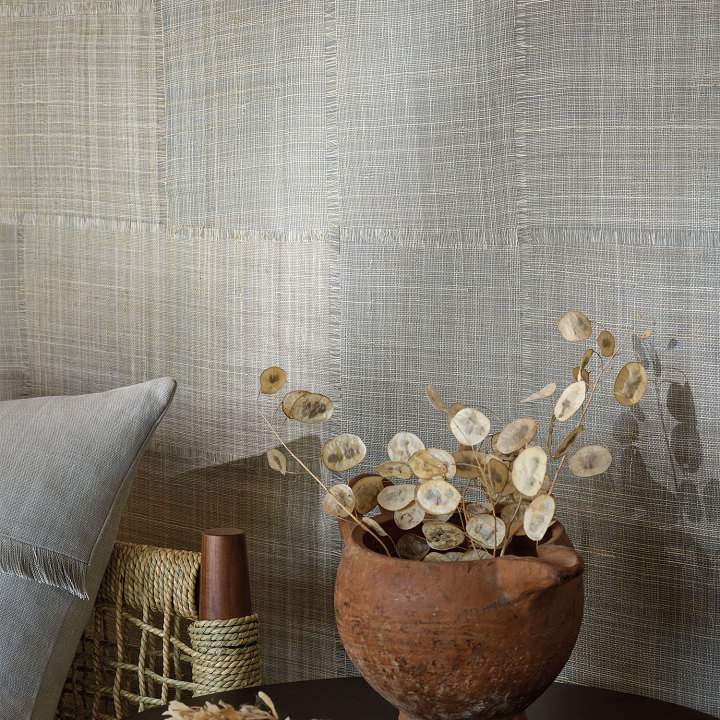 Verschiedene Formen von gewebten Abacá-Strängen werden leicht überlappend auf farbiges Papier aufgebracht, um so ein subtiles Patchwork-Design zu schaffen.