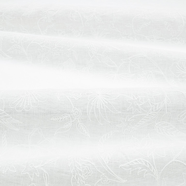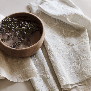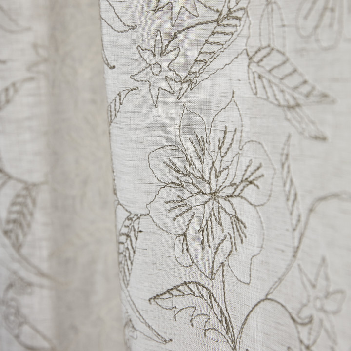 Una serena reinterpretazione di un ricamo in lana tradizionale, questo delicato tessuto ricamato raffigura fiori stilizzati su un fondo di puro lino. Indienne affascina con il suo accattivante aspetto vintage.